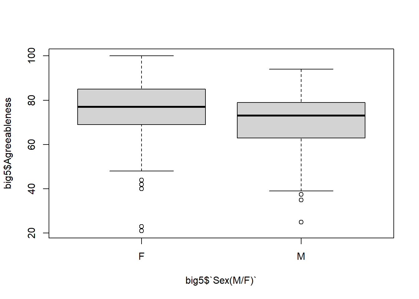 boxplot(big5$Agreeableness ~ big5$`Sex(M/F)`)