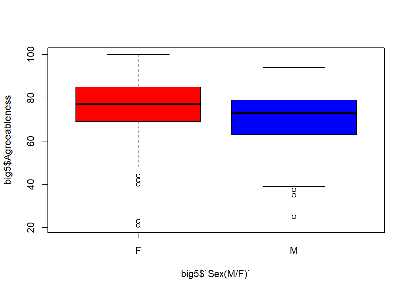 boxplot(big5$Agreeableness ~ big5$`Sex(M/F)`, col = c("red", "blue"))