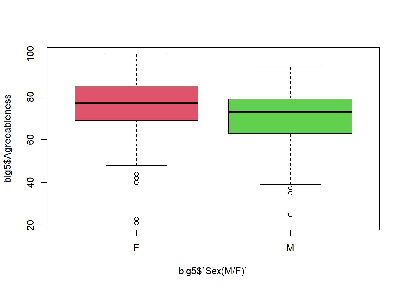 boxplot(big5$Agreeableness ~ big5$`Sex(M/F)`, col = c(2,3))