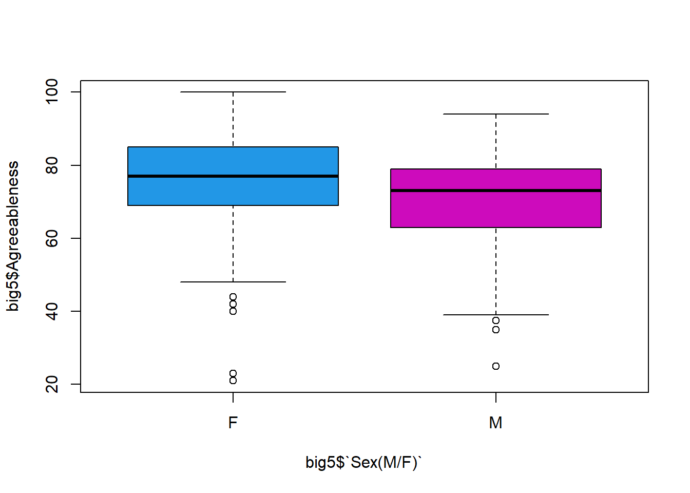 boxplot(big5$Agreeableness ~ big5$`Sex(M/F)`, col = c(4,6))