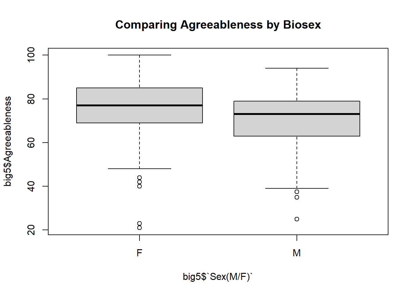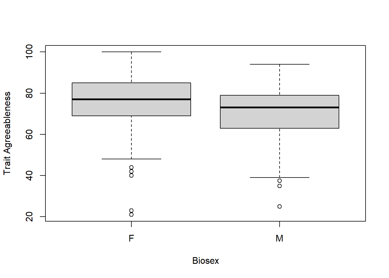 boxplot(big5$Agreeableness ~ big5$`Sex(M/F)`, xlab = "Biosex", ylab = "Trait Agreeableness")
