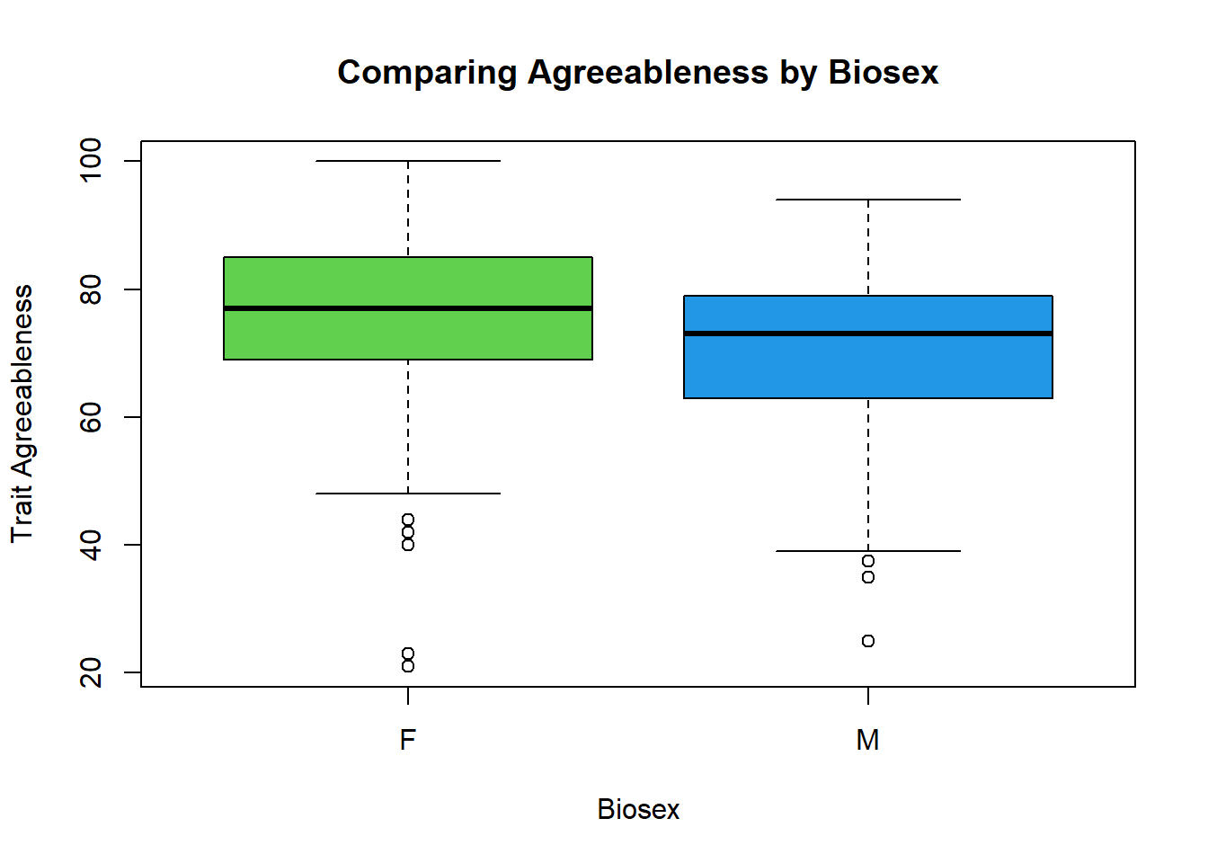 boxplot(big5$Agreeableness ~ big5$`Sex(M/F)`,main = "Comparing Agreeableness by Biosex", xlab = "Biosex", ylab = "Trait Agreeableness", col = c(3, 4))