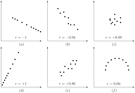 The Correlation Coefficient is called \(r\). It is a number between -1 and 1, with -1 being a perfect, negative correlation (ie. a straight line) and 1 being a perfect, positive correlation.