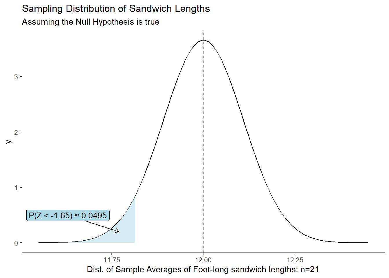 Suppose for now that sandwich-to-sandwich lengths vary by about 0.5 inches and that the distribution is normal. If we sampled 21 random sandwiches from shops in a region and got a sample mean length of 11.82 inches, we can calculate a test statistic as a signal-to-noise ratio: