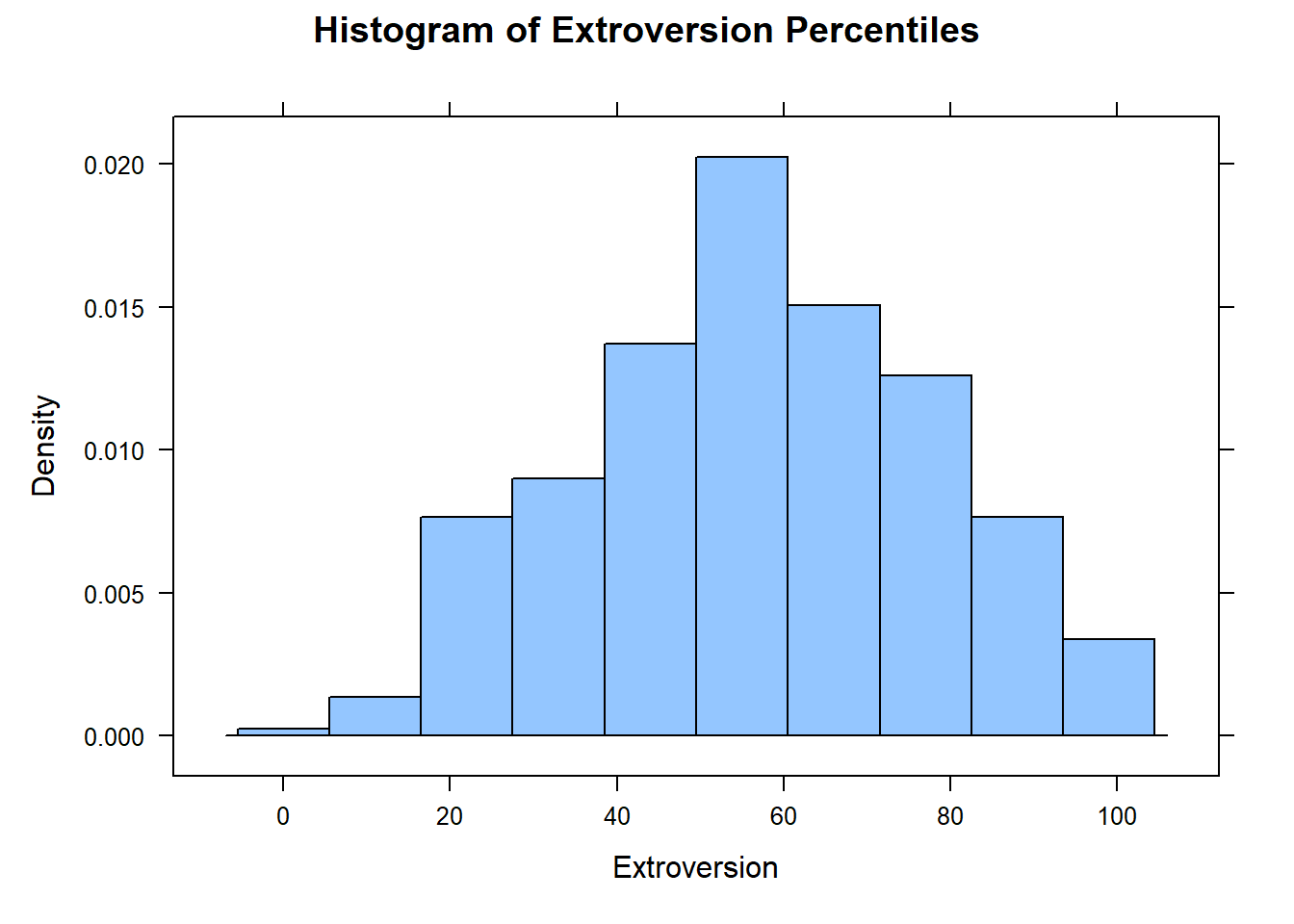 histogram(extrov, xlab = "Extroversion", main = "Histogram of Extroversion Percentiles")