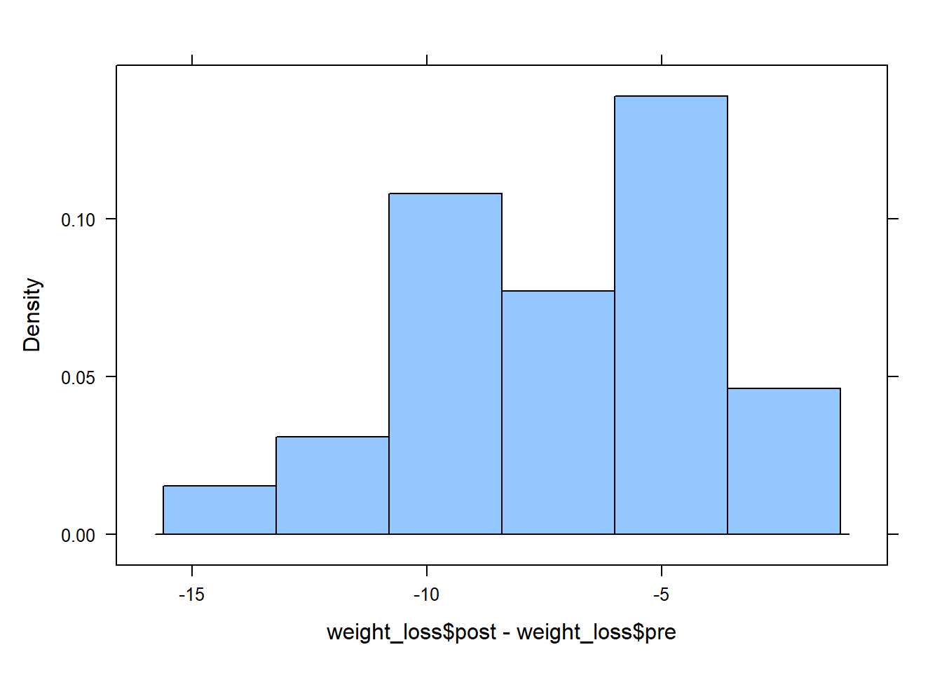 favstats(weight_loss$post - weight_loss$pre) min Q1 median Q3 max mean sd n missing