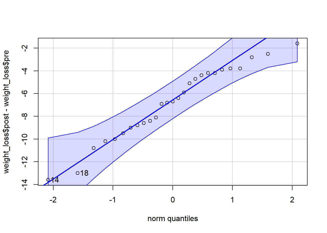 Because \(n < 30\) we need to check the qqPlot() to assess the normality of the differences.