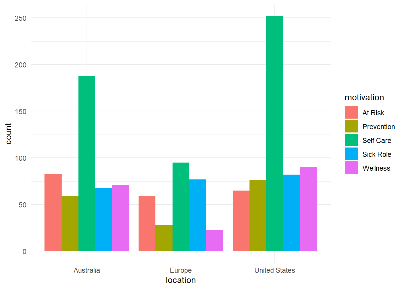 ggplot(chiropractic, aes(x = location, fill = motivation)) +geom_bar(position ="dodge") +theme_minimal()
